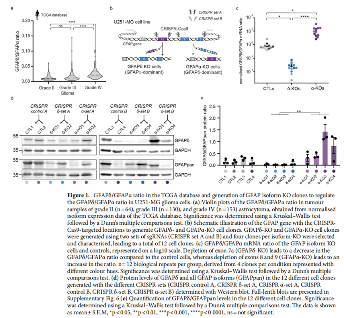 在之前的研究中,作者和其他人已經(jīng)表明,膠質(zhì)瘤惡性腫瘤與GFAP剪接異構(gòu)體水平的改變有關(guān)。因此,癌癥基因組圖譜(TCGA)數(shù)據(jù)庫的RNA測序分析表明,膠質(zhì)瘤惡性程度的增加與GFAP的總體表達(dá)降低以及相對于GFAPα6向更高水平的選擇性剪接變體GFAPδ的轉(zhuǎn)變有關(guān).在體外增加GFAPδ/α比率會導(dǎo)致編碼蛋白質(zhì)的基因上調(diào),這些蛋白質(zhì)參與細(xì)胞與細(xì)胞外基質(zhì)(ECM)之間的相互作用,例如層粘連蛋白、整合素和基質(zhì)金屬蛋白酶2(MMP-2)。此外,神經(jīng)膠質(zhì)瘤組織樣本的免疫組織化學(xué)分析將GFAPδ表達(dá)與改變的細(xì)胞形態(tài)以及基于神經(jīng)影像學(xué)的更具侵襲性的腫瘤聯(lián)系起來。盡管這些觀察結(jié)果暗示了GFAP同種型表達(dá)改變后膠質(zhì)瘤細(xì)胞行為的改變,但尚未對改變的行為進(jìn)行全面表征。