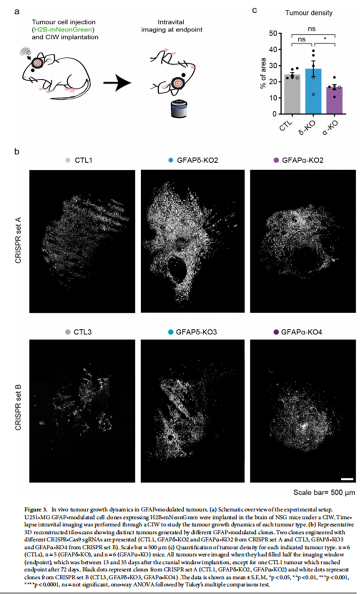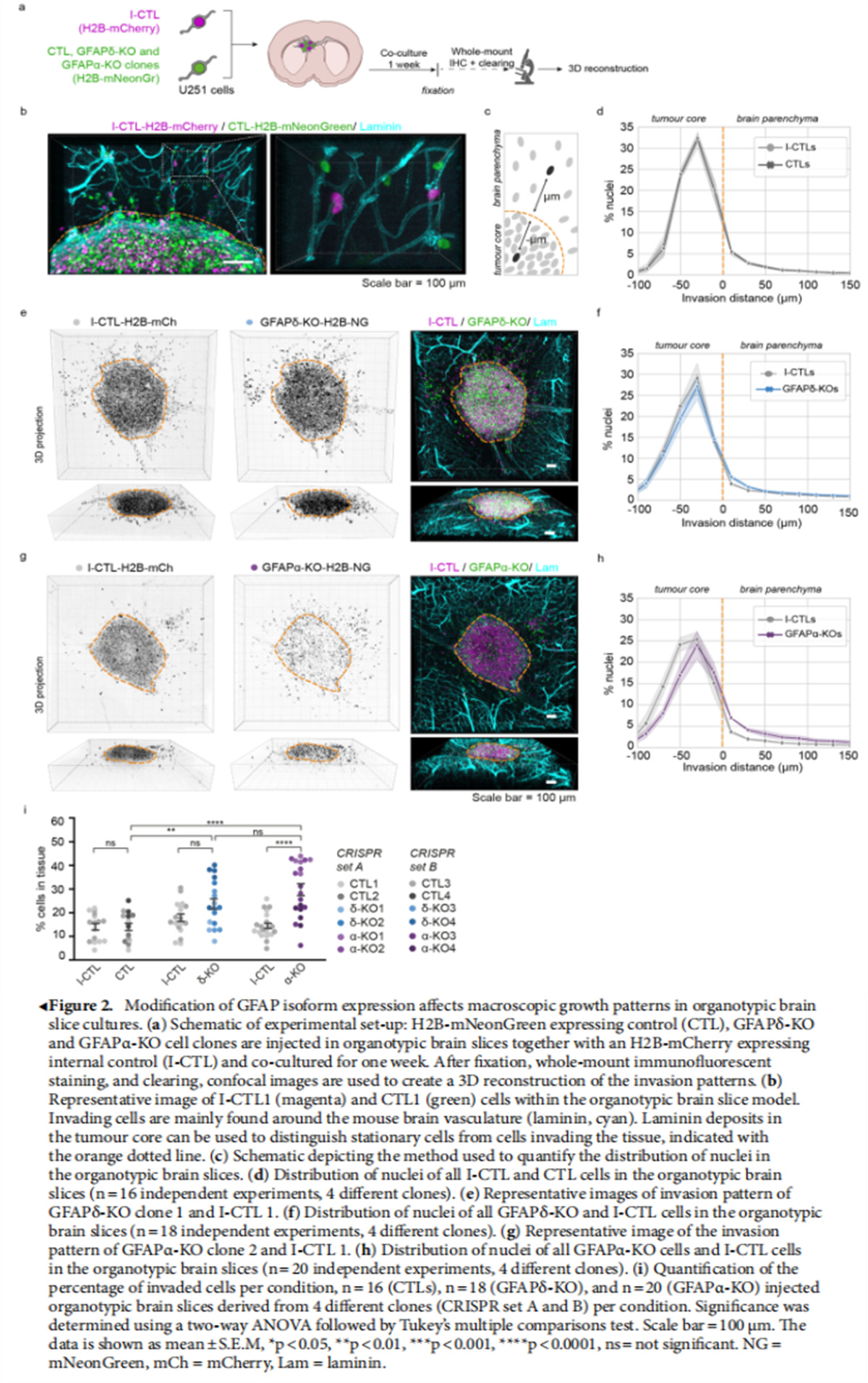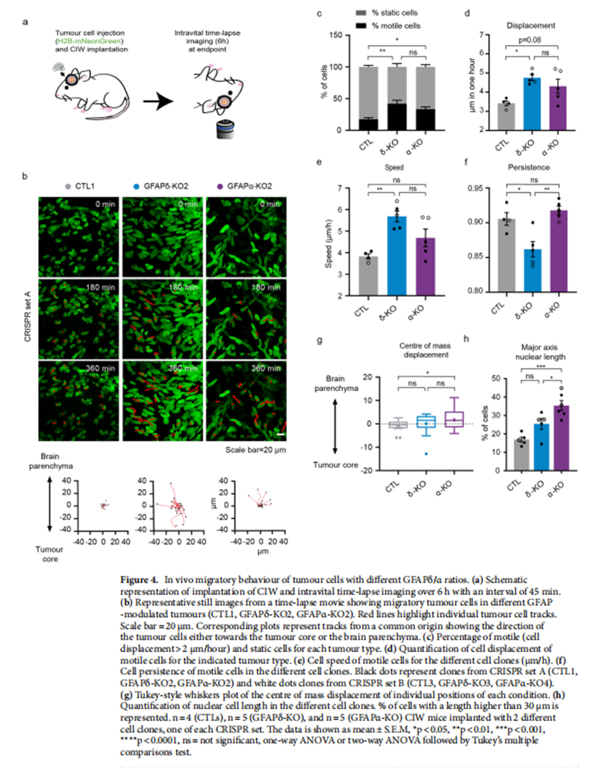 低級別和高級別膠質(zhì)瘤之間的GFAP異構(gòu)體表達(dá)不同(見圖一);使用CRISPR-Cas9修飾GFAPisoform表達(dá)(見圖一);GFAP亞型的消耗增加了離體器官型腦切片中的細(xì)胞侵襲(見圖二);GFAPα同種型的消耗導(dǎo)致體內(nèi)更多的彌漫性腫瘤(見圖三);GFAP同種型的消耗增加了運(yùn)動性并改變了體內(nèi)的入侵模式(見圖四);